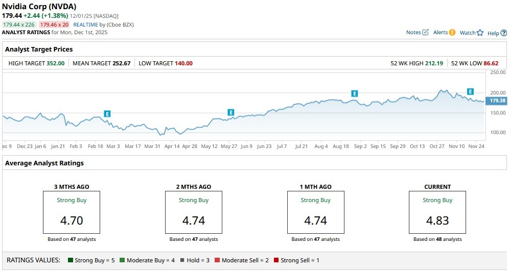 The consensus rating on Nvidia shares remains at “Strong Buy” with the mean target of about $253 indicating potential upside of another 40% from current levels.