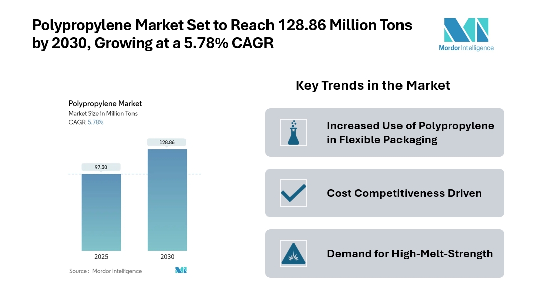 The global polypropylene market is showing consistent growth supported by strong demand from packaging, automotive, consumer goods, and electrical industries. The polypropylene market is projected to increase from 97.30 million tons in 2025 to 128.86 million tons by 2030, registering a CAGR of 5.78%.