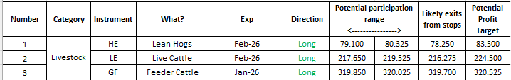 Ideas for Livestock trades. Stay within the confines of the potential participation ranges and adhere strictly to risk management with stops that you do not move after trade entry: