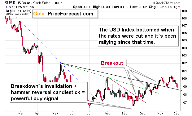 There’s a lot of uncertainty in the world, but gold had already soared profoundly, and no market can move up or down without periodic corrections (well, maybe except silver after major breakouts – like this one). And this time, the trigger for gold’s decline can come from rallying USD, which is – after all – poised to rally given the situation with tariffs. The latter are positive factor for the USD, and the USD declined after the announcements due to chaotic nature of the introduction. But the dust has pretty much settled and it’s time for the USD Index to rally back up.