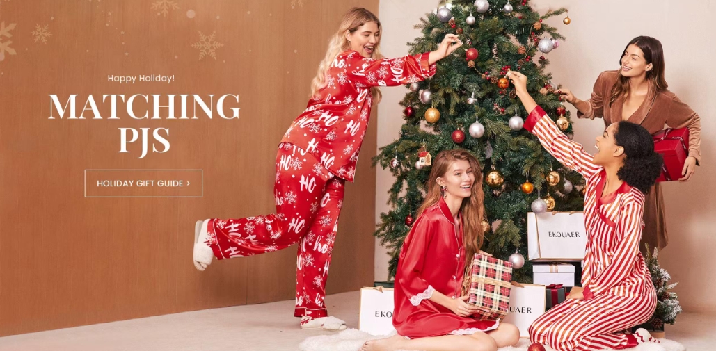 EKOUAER focuses on women’s loungewear, featuring a selection of popular items: the satin pajama set offers a soft, smooth texture that is breathable and skin-friendly; the knitted ribbed set provides elasticity and comfort, perfect for lounging at home or casual outings; the licensed teddy bear design adds festive fun with its playful touch and smooth satin material.
