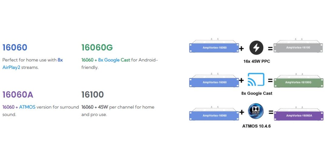 The AmpVortex-16060 is an entry-level multi-zone amplifier for home theaters and small offices, with 16-channel output (65W per channel), Bluetooth 5.0, multi-zone sync, and simple plug-and-play setup with basic EQ adjustments.