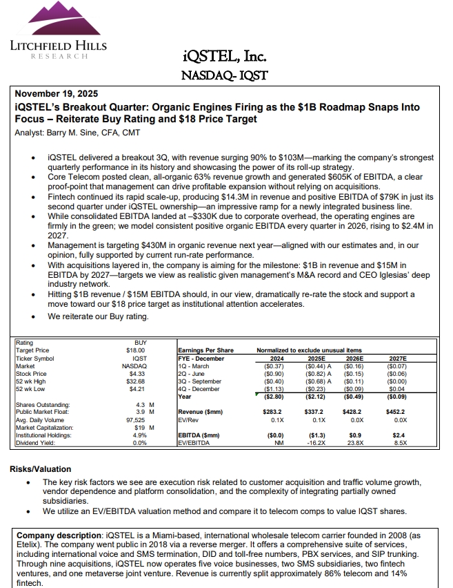 - Litchfield Hills Research Issues Recommendation and Detailed Report on IQSTEL (IQST) with $18 Price Target.
