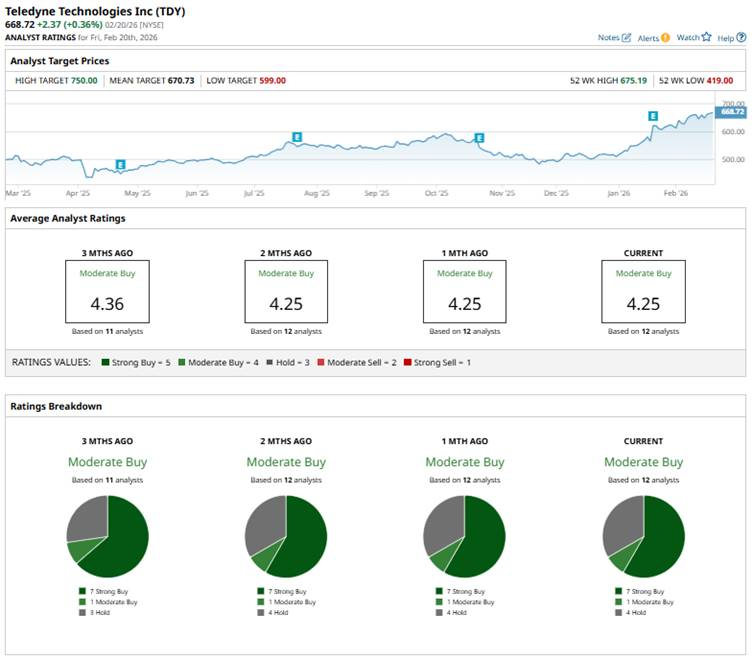 Among the 12 Wall Street analysts covering Teledyne’s stock, the consensus is a “Moderate Buy.” That’s based on seven “Strong Buy” ratings, one “Moderate Buy,” and four “Holds.”