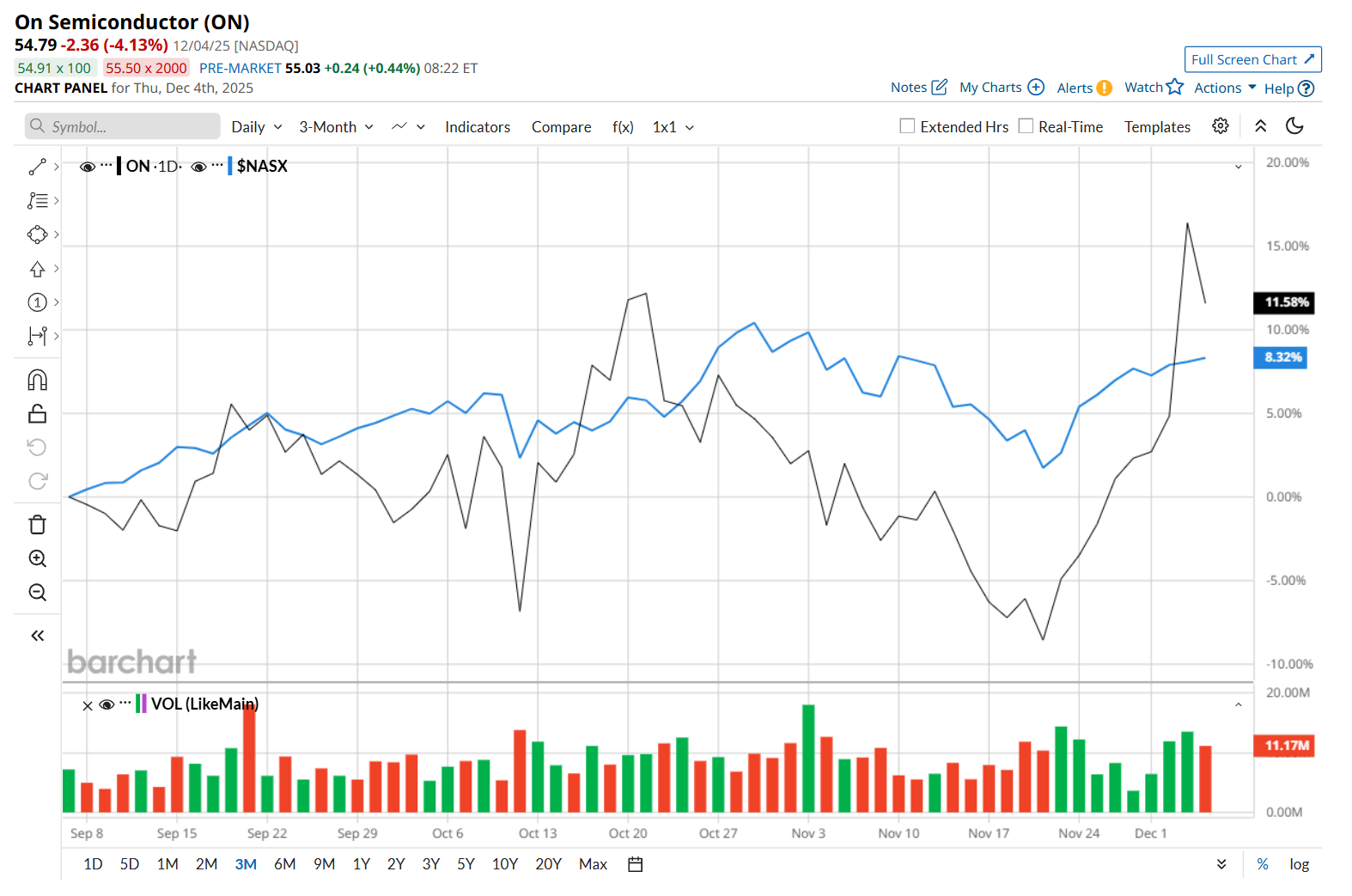 This tech company is currently trading 22.4% below its 52-week high of $70.58, reached on Dec. 17, 2024. Shares of ON have gained 14% over the past three months, outperforming the Nasdaq Composite’s ($NASX) 8.3% rise during the same time frame.