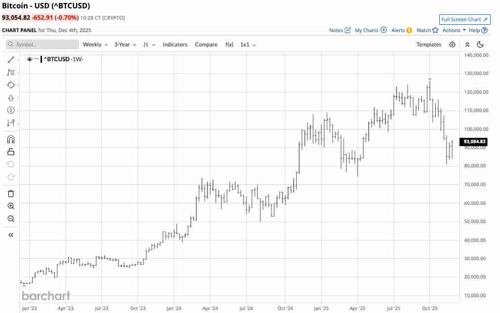 The year-to-date chart highlights the pattern of lower highs and lower lows that has taken Bitcoin to a low of $80,742.05 on November 21. At just above the $93,000 level on December 1, Bitcoin remains in a bearish trend, but has recovered from the most recent low.