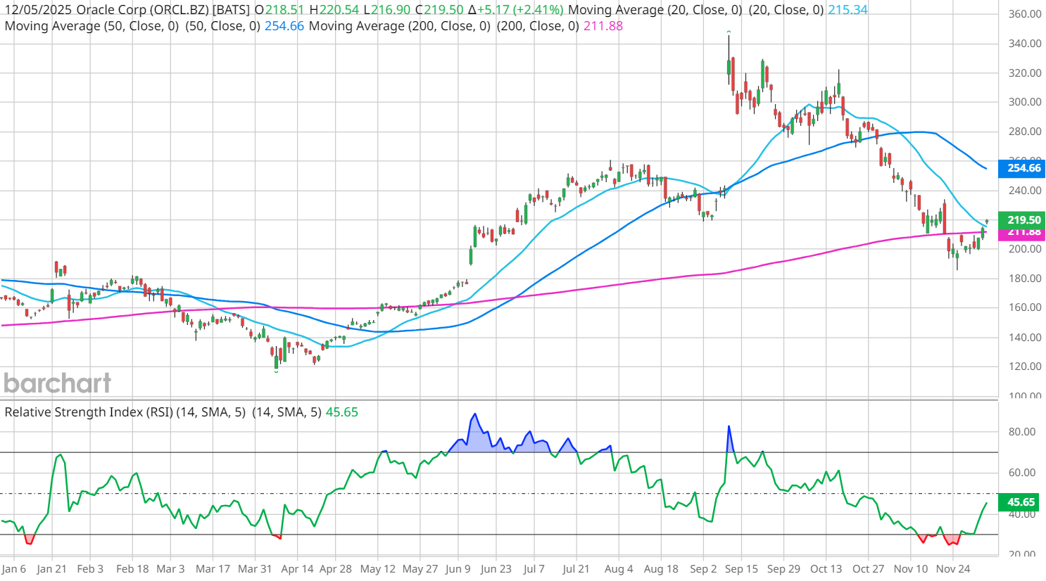 Concerns over the company’s debt-fueled growth helped to spark a pullback in ORCL from its highs, even earning a special call-out from notorious permabear Michael Burry in his critique of the AI bubble. Barchart’s own Senior Market Strategist John Rowland, CMT, flagged the stock’s debt-to-equity ratio as a “cautionary tale”; the metric currently stands at a stomach-churning 3.33.