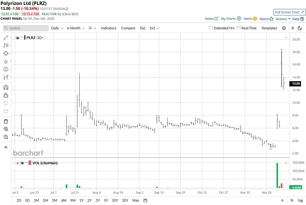 Following their initial 5-day peak of over $18 hit on Thursday, Dec. 4, Polyrizon shares have pulled back significantly. Still, they remain up a whopping 300% versus the start of December. Â