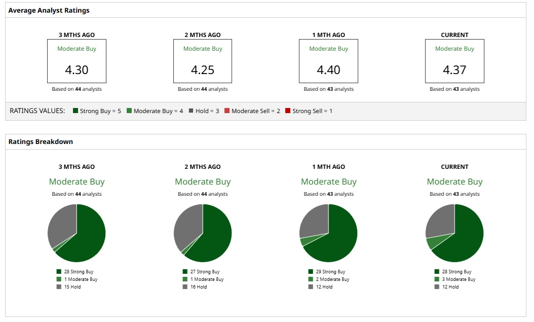 While 28 analysts have assigned a “Strong Buy” rating, three and 12 analysts have a “Moderate Buy” and “Hold” rating, respectively.