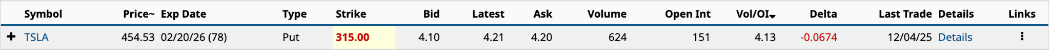 In yesterday’s unusual options activity, Tesla’s Feb. 20/2026 $315 put stands out to me. Deep OTM (30.7%), Tesla last traded around $315 in August.