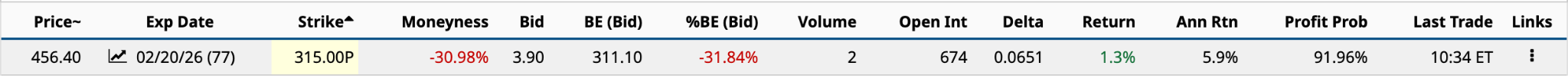 Further, as the DTE shrinks, so too does the annualized return. The Jan. 16/2026 $315 has a current bid price of $1.45 and an annualized return of 4.0%.