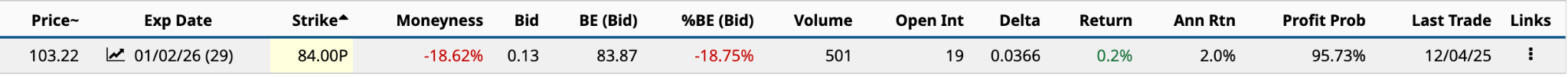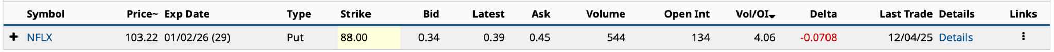 One of the 11 is the Jan. 2/2026 $88 put. It had a Vol/OI ratio of 4.01.