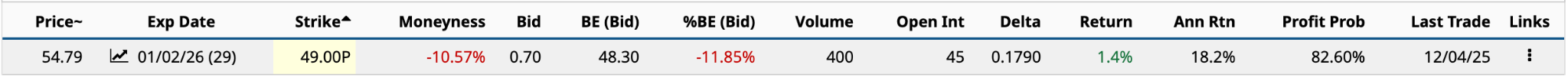 The $49 strike is 10.57% OTM, with a $48.30 breakeven, and an annualized return of 18.2% on the $70 premium. From where I sit, that is attractive to anyone interested in generating income while obtaining a better entry point to go long ON.