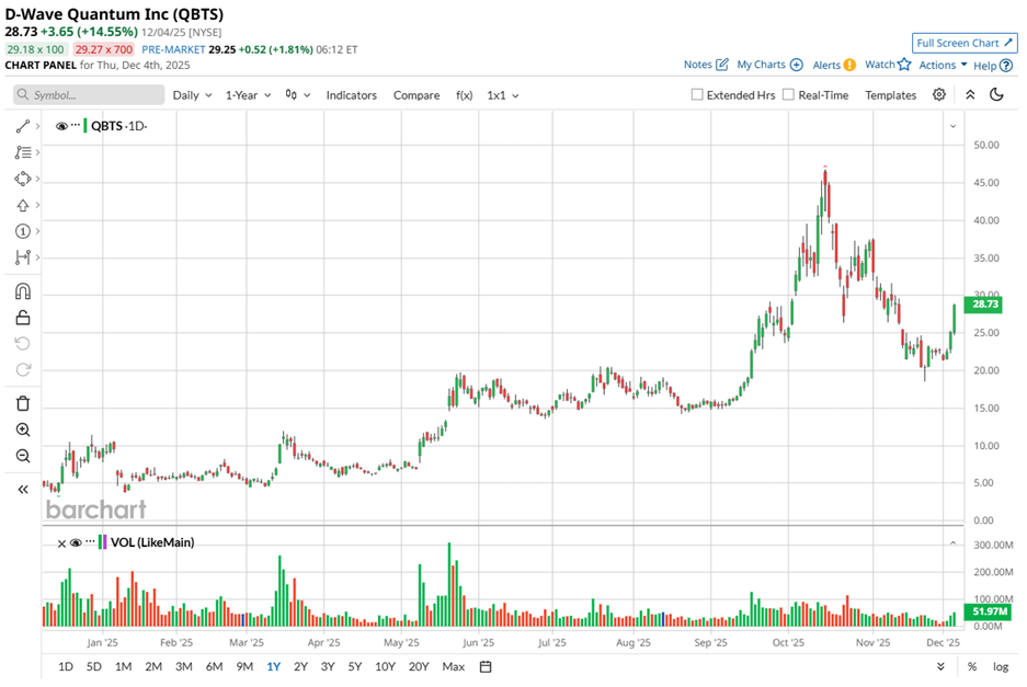 Following the announcement, the stock jumped approximately 5% on Dec. 2, added another 11.5% the next day, and climbed 14.6% as of Dec. 4. Now up 224% year-to-date (YTD), the stock leaves investors weighing whether D-Wave’s momentum still has room to run or if enthusiasm has already been priced in.