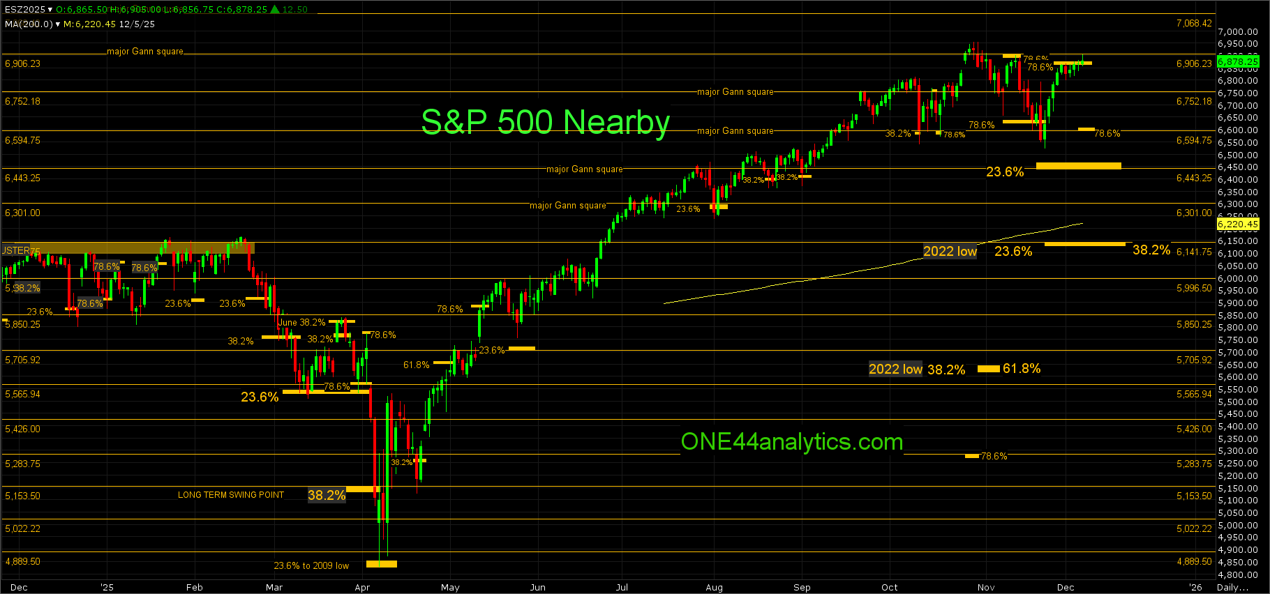 Below it, the short term target is 78.6% back to the 11/21/25 low at 6609.00 per the ONE44 78.6% rule, there is also the 6594.75 major Gann square for added support. The longer term target area is 23.6% back to the 4/7/25 low at 6466.00 and the 6443.25 major Gann square. The long term target and long term swing point is 38.2% of the same move at 6141.75 this also lines up exactly with 23.6% back to the 2022 low and a major Gann square to make it an even more important level. The 200 day average is now 6202.00. There is one major Gann square before then to look for support and then use as the swing point when it is closed below at 6290.75.