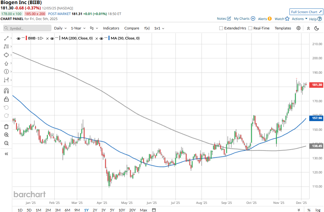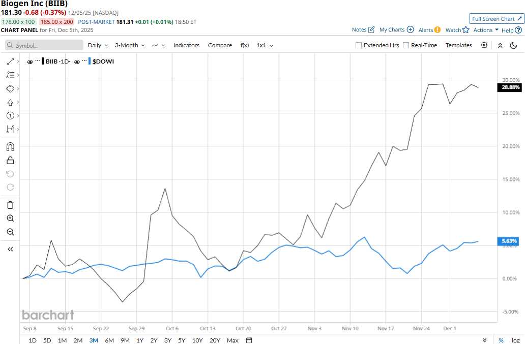 BIIB stock touched its 52-week high of $185.17 on Nov. 24 and is currently trading 2.1% below that peak. Meanwhile, the stock has soared 28.9% over the past three months, significantly outperforming the Dow Jones Industrial Average’s ($DOWI) 5.6% uptick during the same time frame.