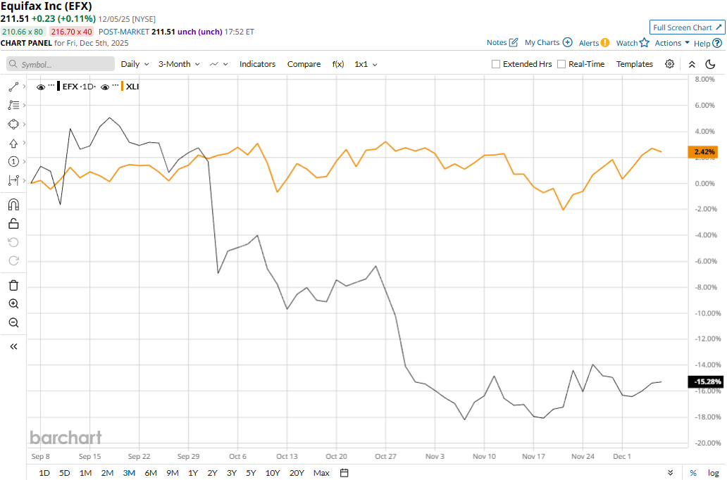 Equifax touched its 52-week high of $281.07 on Jan. 27 and is currently trading 24.7% below that peak. Meanwhile, EFX stock has plunged 15.3% over the past three months, lagging behind the Industrial Select Sector SPDR Fund’s (XLI) 2.4% uptick during the same time frame.