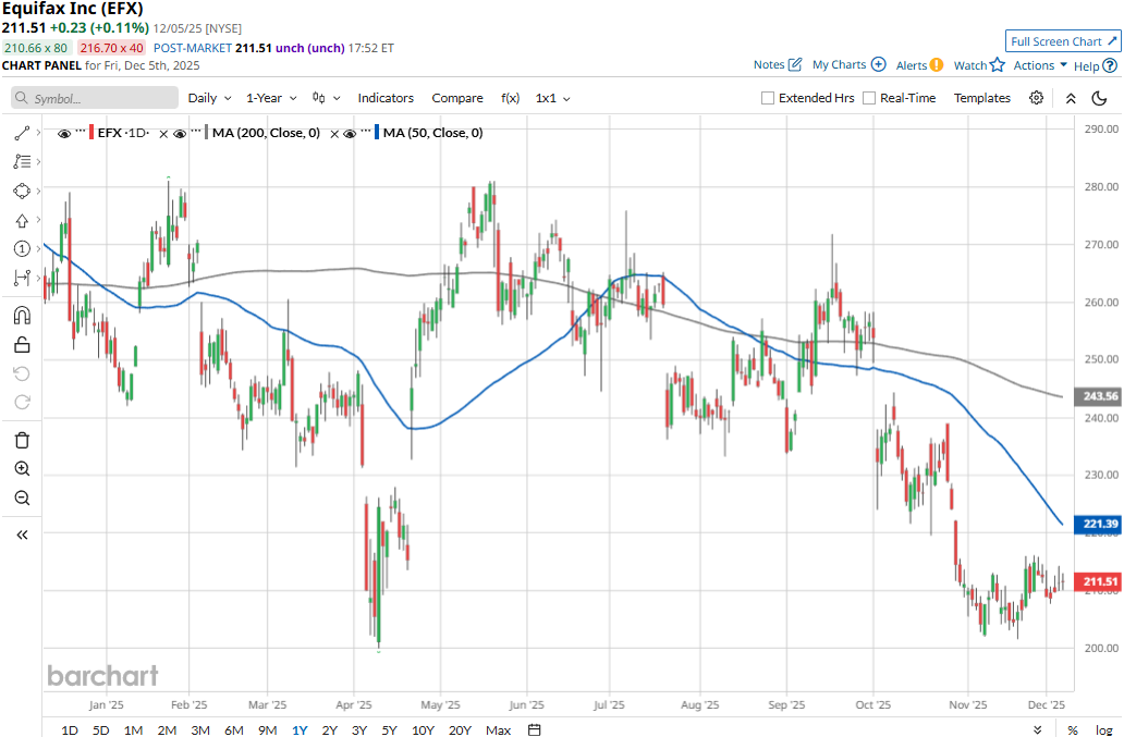 When compared to its peer, EFX stock has underperformed TransUnion’s (TRU) 8.9% decline in 2025 and 14.2% plunge over the past 52 weeks.