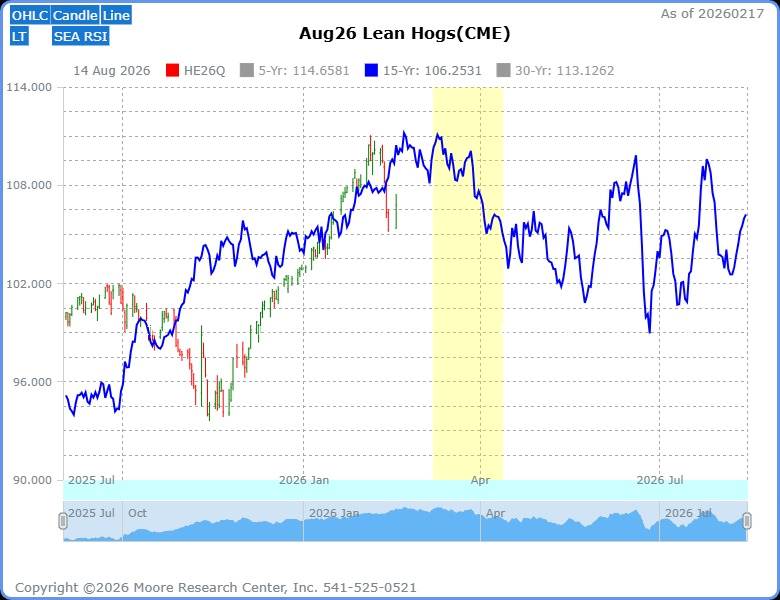 MRCI has researched the August 2026 lean hog futures contract and found an optimized seasonal window (yellow box). Liquidity may be low in the August contract at this time; traders may wish to use the June contract. The 15-year seasonal pattern (blue line) shows the lowest peak-season prices, which persist through the end of the winter season, when demand and prices peak.