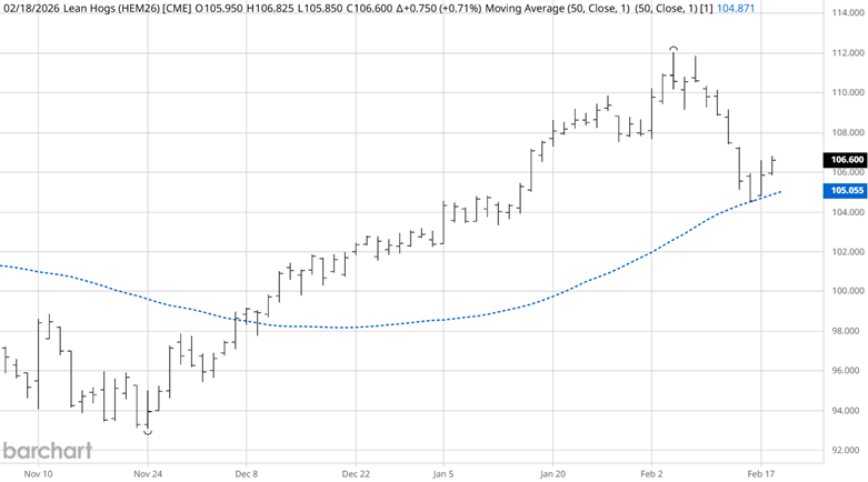 The June lean hog daily chart shows the early-winter seasonal low, which occurs during the peak pork marketing period. Once the price traded above the 50-day simple moving average (SMA), it continued on its seasonal path to February. Since peaking, prices have returned to the SMA and are finding some support. The key at this level is to watch prices and see if they begin closing under and turning down the SMA to confirm a downtrend before attempting to sell. More aggressive traders could find some higher resistance levels to begin selling and possibly build a core position.