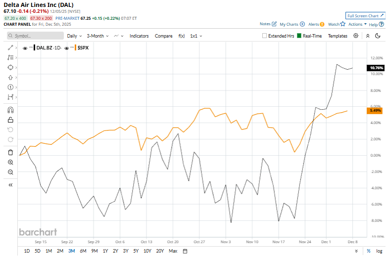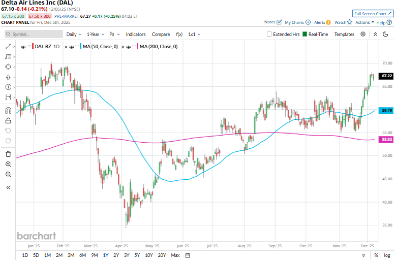 Shares of the airline company have decreased 4.1% from its 52-week high of $69.98. Delta Air Lines’ shares have increased 9.7% over the past three months, outperforming the S&P 500 Index ($SPX) 6% surge over the same time frame.