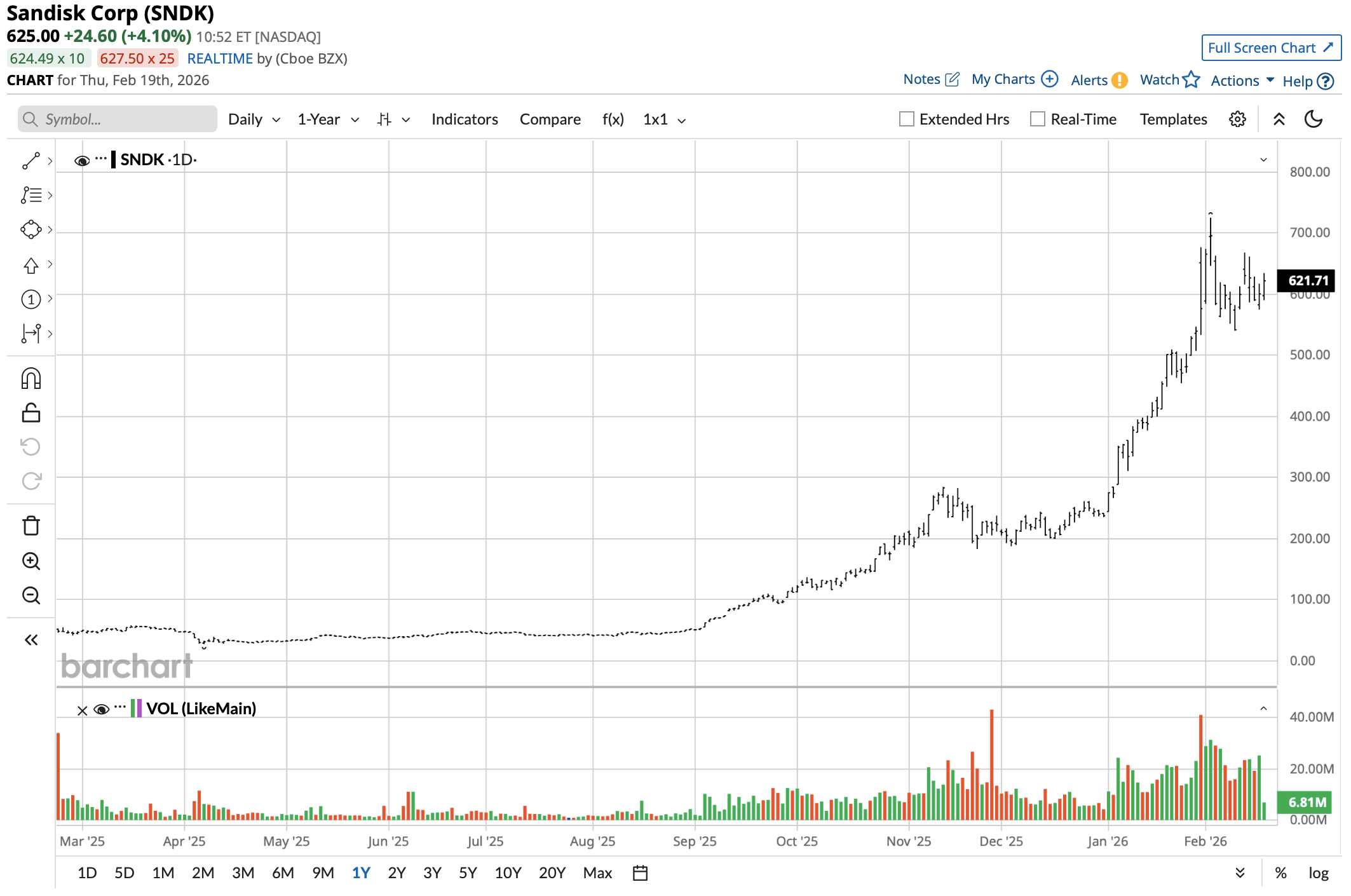 Sandisk is a leading flash memory storage solutions company that caters to the data storage and memory markets. Headquartered in Milpitas, California, the company currently has a market capitalization of about $95.9 billion. SNDK stock has been highly volatile in the past 52 weeks, ranging from a low of $27.89 to a high of $725. Shares currently trade at about $650, climbing rapidly on the day following the recent earnings report.