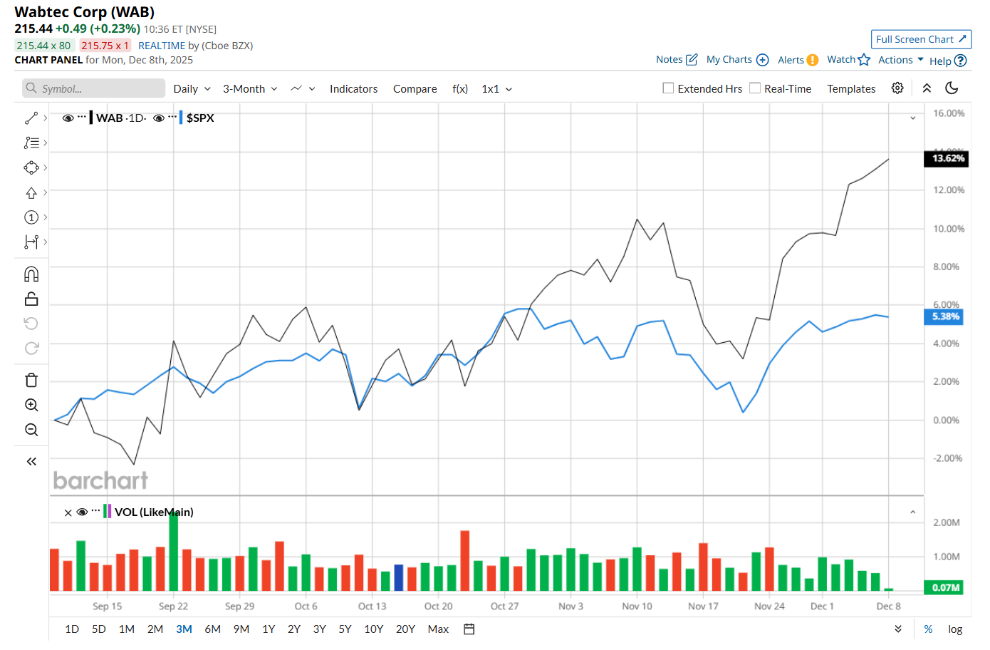 This railroad company is currently trading marginally below its 52-week high of $216.10, reached on Jul. 8. Shares of WAB have gained 12.6% over the past three months, outperforming the S&P 500 Index’s ($SPX) 5.7% rise during the same time frame.