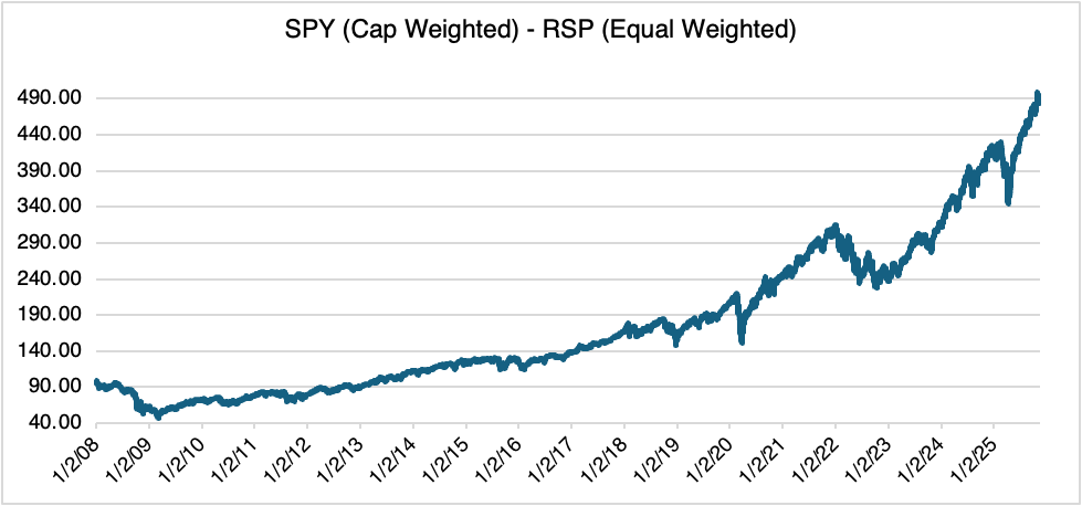 First, many point out that the bull market has been dominated by just a few AI-related names but lacks the breadth that is characteristic of sustainable overall returns. For example, Nvidia alone contributed more than 20% of the S&P 500’s return in 2024 and 2025. When combined with the other members of the Magnificent Seven, they now comprise approximately 37% of the S&P 500’s total market capitalization. If we look at the spread between the traditional, capitalization-weighted version (SPY) versus one with equal weight (Invesco S&P 500 Equal Weight ETF (RSP), this becomes clear: