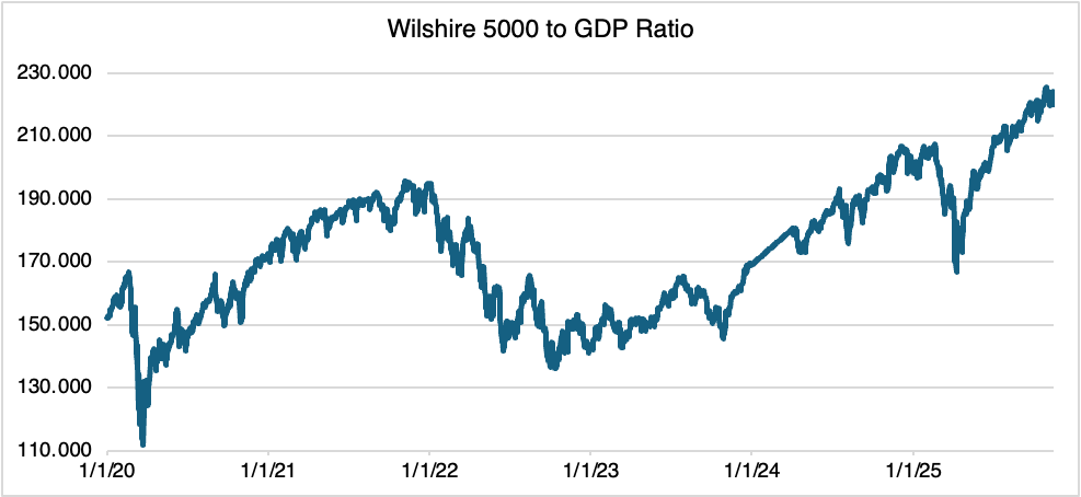 Continuing with the overvaluation theme, many point out to market capitalizations as a percentage of GDP, the so-called “Buffett Indicator.” The theory goes that if the value of the market is growing faster than the economy, then it is overbought, and possibly even in a bubble.
