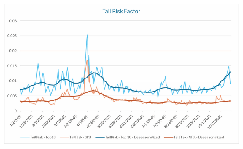 As you can see, the tail risk factor for the top-10 diverged significantly in October, even when seasonally adjusted, implying higher prices for short-term downside protection and a greater probability of negative price action for the limited number of stocks currently driving the S&P higher.