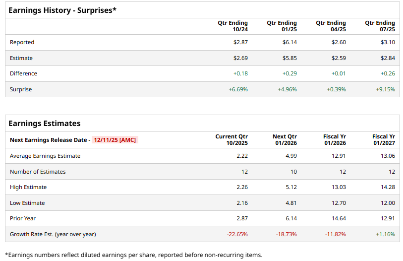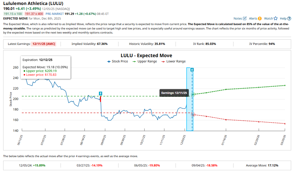 However, LULU stock is gaining positive momentum ahead of its Q3 earnings on Dec. 11. LULU stock has gained about 10.7% over the past month. Despite this recent uptick, investors should remain cautious. Historically, Lululemon shares have declined following earnings announcements in each of the last three quarters. Currently, options traders are pricing in a potential post-earnings move of around 10.1% in either direction, which is below the stock’s average four-quarter movement of 17.1%.