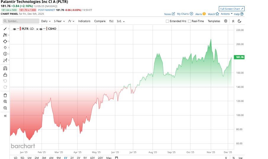 Valued at around $435 billion by market cap, shares of PLTR have surged about 140% year-to-date (YTD). It climbed to an all-time high $207 in early November. This rally was fueled by blowout earnings and AI optimism, even outpacing gains in Nvidia. However, after hitting that peak, the stock pulled back 12% to around $182, roughly on par with today’s trading level, due to insider pressure and valuation concerns. In short, PLTR went from a deep-value perch earlier this year to trading near record highs, as investors priced in rapid growth.