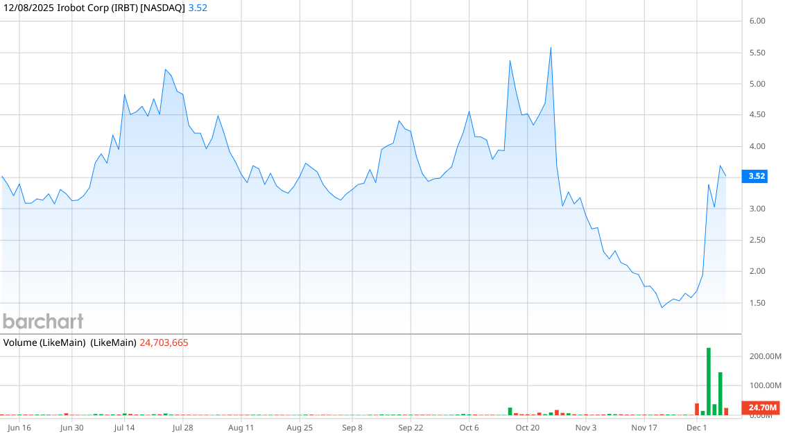 Because iRobot is small, it doesn’t get a lot of attention from analysts—currently there is one analyst surveyed by Barchart who has a hold rating on iRobot and a price target of $11—nearly 200% higher than the current stock price.