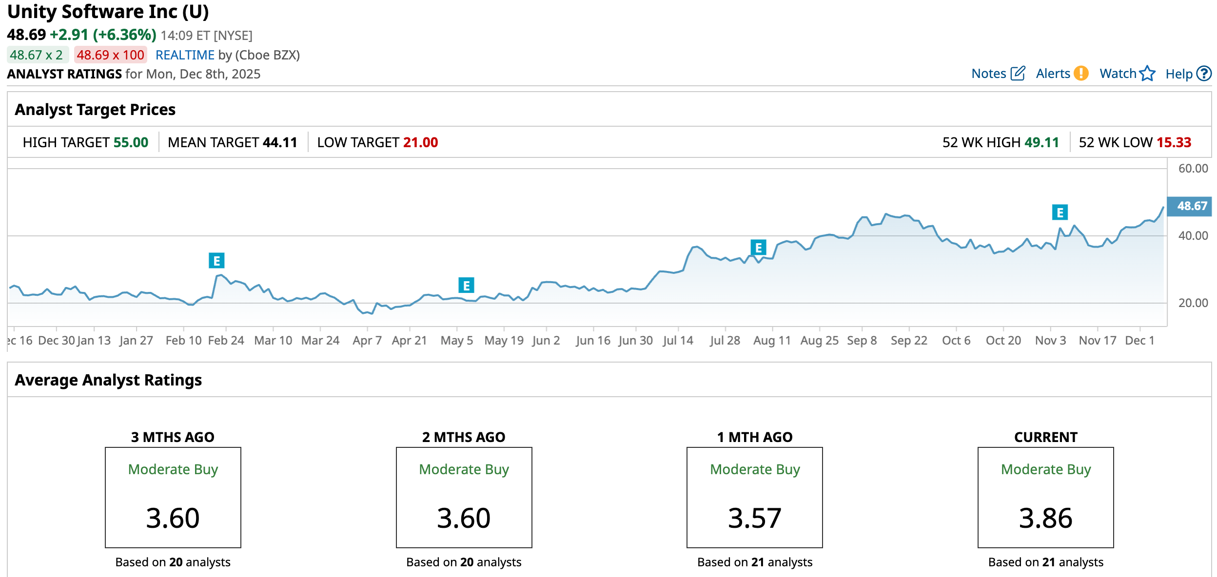 Arete Research recently shifted its stance on U, upgrading the stock to “Buy” from “Neutral” and setting a new price target of $48. Wells Fargo followed with its own adjustment, as analyst Alec Brondolo raised his target to $51 from $42, reinforcing the view that Unity’s long-term positioning continues to strengthen.