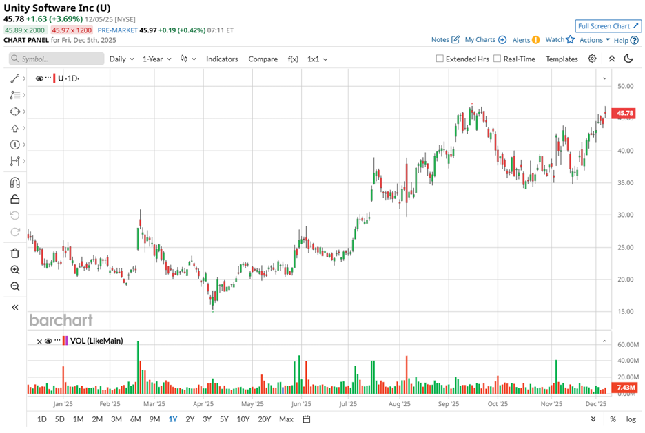 In this landscape, Unity Software (U) has become that backbone. It already powers over half of the world’s mobile games and is steadily extending its reach into sectors like automotive, architecture, engineering, and beyond. The market has taken notice as the stock, which was already up almost 116% year-to-date (YTD), gained another 3.7% on Friday, Dec. 5, after Wells Fargo & Company (WFC) upgraded the stock, owing to Unity’s solid fundamentals.