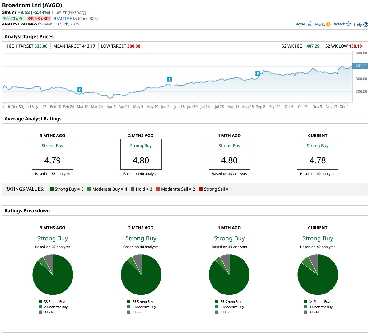 Susquehanna analyst Christopher Rolland just raised the price target on AVGO stock to $450 from $400 and maintained a “positive” rating. The optimism centers on Google's (GOOG) (GOOGL) new TPUv7 chip, which is performing better than expected and attracting major customers like Anthropic and Meta (META).