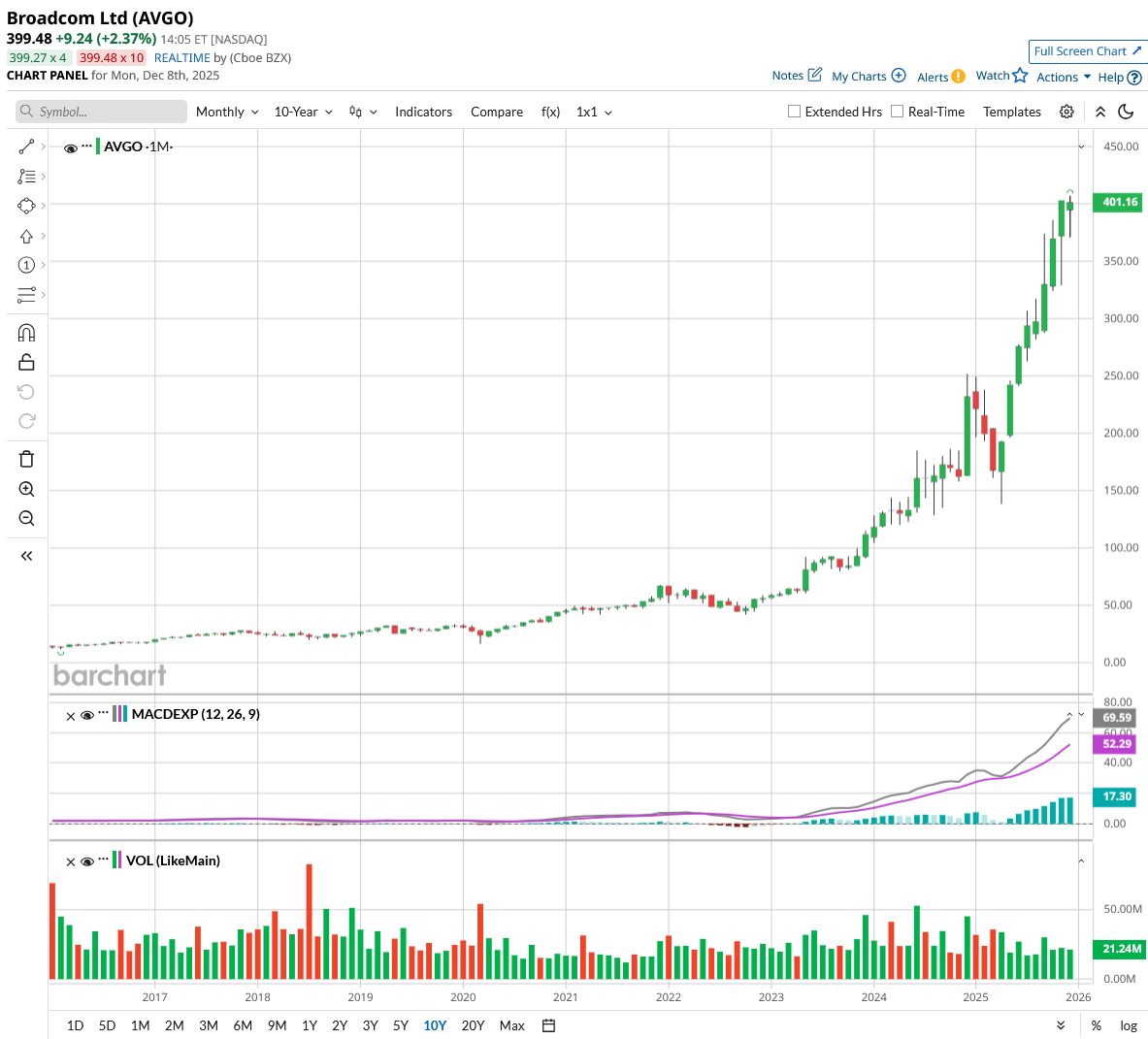 Valued at a market cap of $1.84 trillion, Broadcom (AVGO) stock has returned about 120% since last December and is up over 2,500% in the past decade. Broadcom is gaining significant traction in the rapidly expanding AI market and continues to power AI infrastructure.