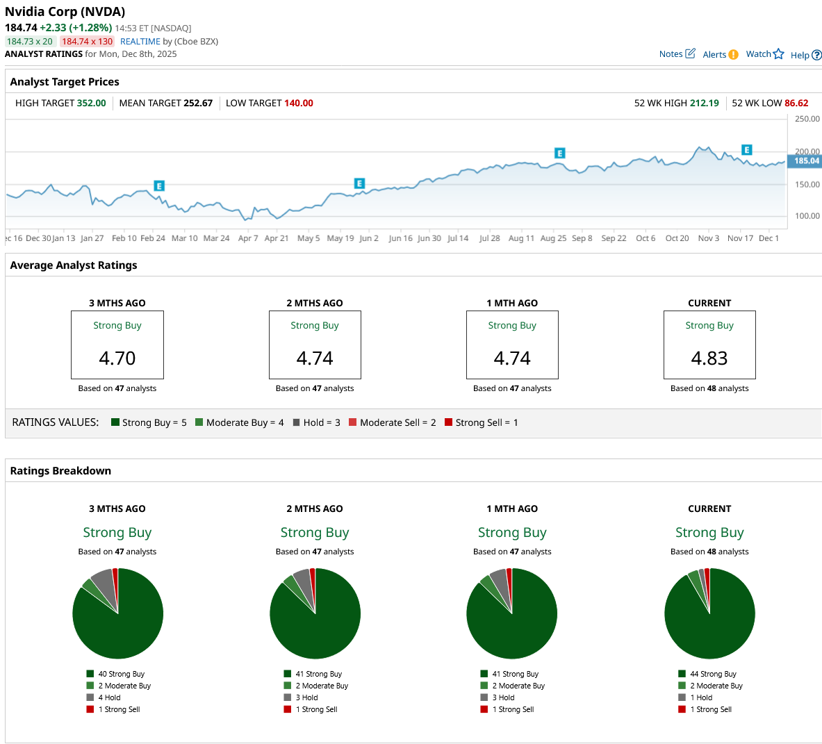 Wall Street analysts remain broadly optimistic about Nvidia’s outlook, as reflected in the stock’s top-tier consensus “Strong Buy” rating. Out of the 48 analysts covering NVDA stock, 44 rate it a “Strong Buy,” two call it a “Moderate Buy,” one suggests holding, and the remaining one gives it a “Strong Sell” rating. The average price target for NVDA is $252.67, suggesting a 37% upside potential from current levels.