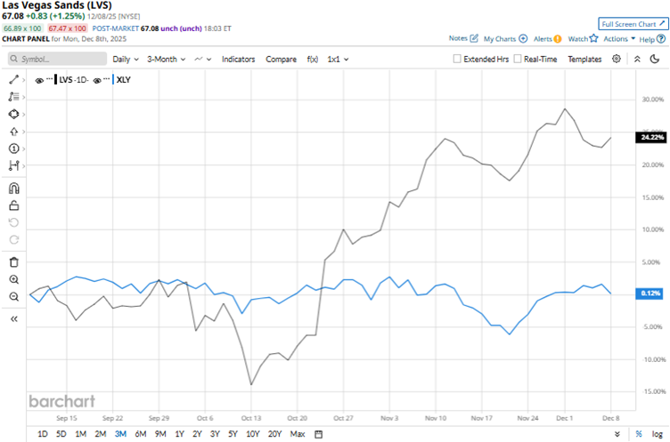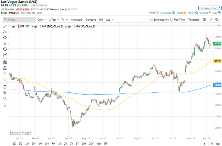 Over the longer term, this outperformance persists. The stock has gained 24.3% over the past 52 weeks and 66.8% over the past six months. Contrarily, the Consumer Discretionary ETF is up 1.4% and 11.2% over the same periods, respectively. LVS’s stock has been trading above its 200-day moving average since late June and above its 50-day moving average since late October.