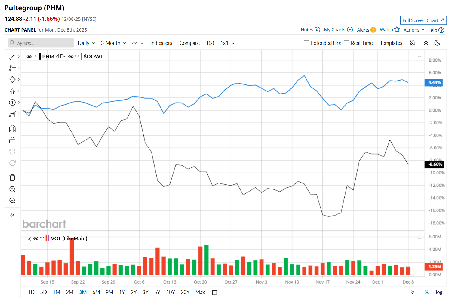 This homebuilder has slipped 12.1% below its 52-week high of $142.11, reached on Sep. 5. Shares of PHM have declined 11.7% over the past three months, underperforming the Dow Jones Industrial Average’s ($DOWI) 4.9% rise during the same time frame.