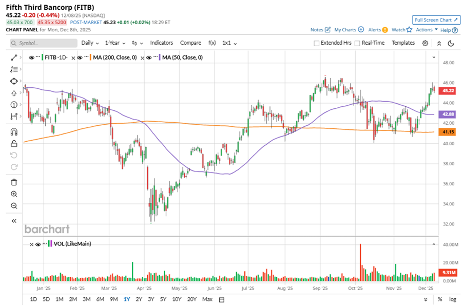 To confirm the bullish trend, FITB has been trading above its 50-day moving average since late November. The stock has been trading above its 200-day moving average since early July, with slight fluctuations.