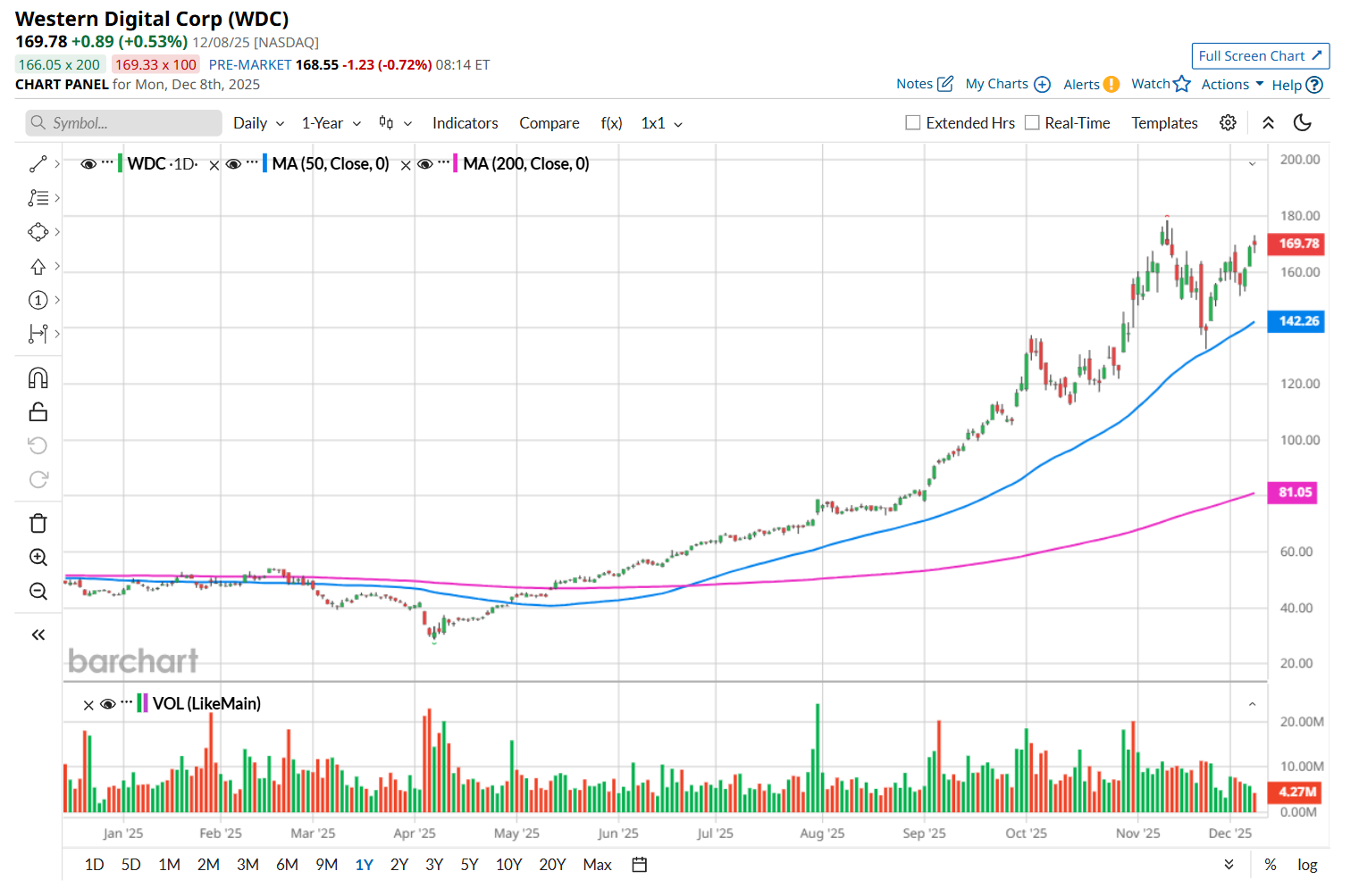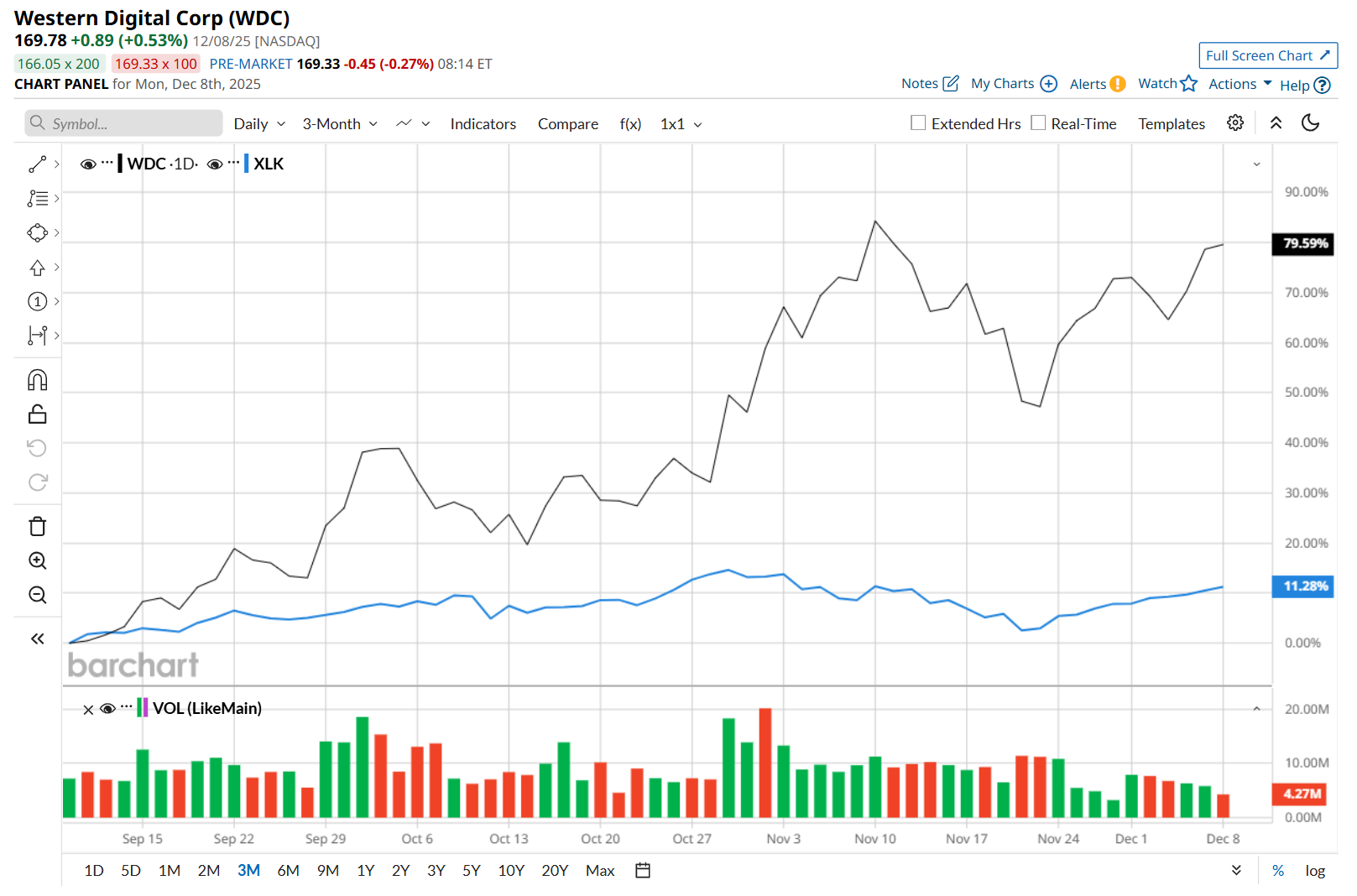 This data-storage technology company is currently trading 4.9% below its 52-week high of $178.45, reached on Nov. 11. Shares of WDC have soared 82% over the past three months, significantly outperforming the State Street Technology Select Sector ETF’s (XLK) 11.5% rise during the same time frame.