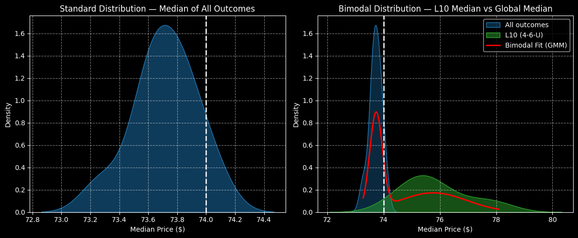 Following the objectification process and running a probabilistic algorithm on the ASTS stock price, its forward 10-week returns can be arranged as a distributional curve, with outcomes ranging between $72.80 and $74.50 (assuming an anchor price of $74, Monday’s close). Further, price clustering would likely be predominant at around $73.70.