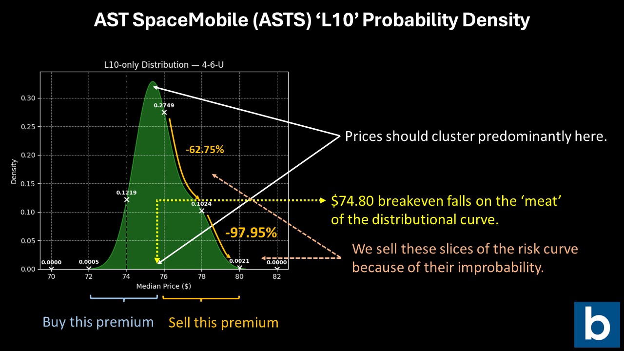 Thanks to the intelligence we collected, it’s my opinion that the 70/80 bull call spread expiring Jan. 16, 2026, represents the most viable trade. While this requires ASTS stock to rise through the second-leg strike at expiration, the breakeven point is $74.80. That’s basically right on the peak of the probabilistic mass, which theoretically means that we should have a decent chance of at least breaking even.