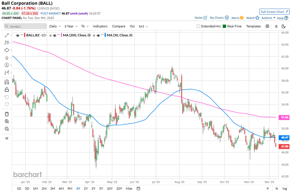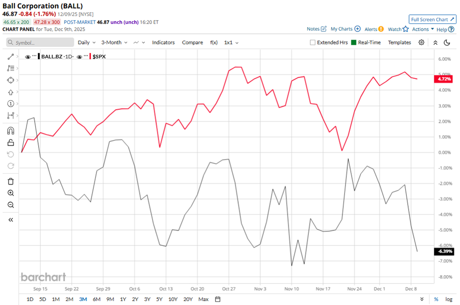 Shares of the Westminster, Colorado-based company have fallen 22.3% from its 52-week high of $60.28. BALL stock has declined over 7% over the past three months, underperforming the broader S&P 500 Index’s ($SPX) over 5% gain over the same time frame.