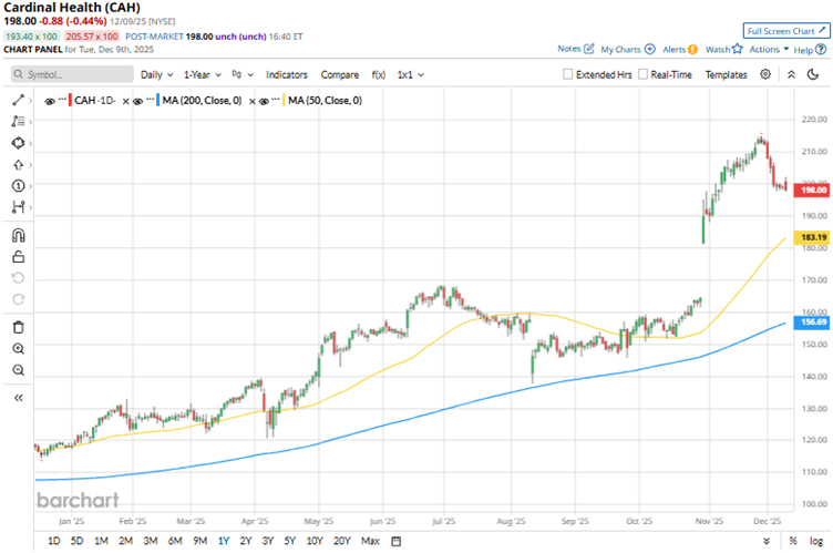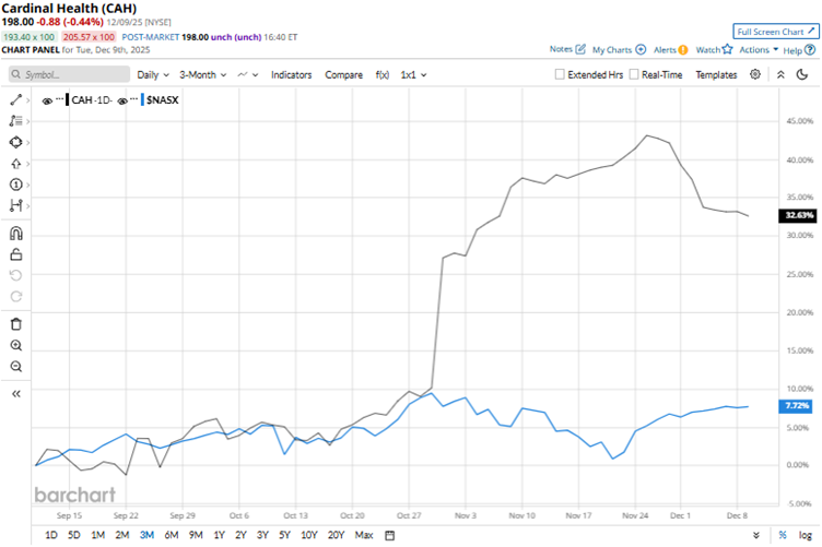Over a more extended period, this outperformance persists. Over the past 52 weeks, Cardinal Health’s stock has gained 62.9%, while it has been up 28.9% over the past six months. The Nasdaq Composite has gained 19.5% and 20.3% over the same periods, respectively. Cardinal Health’s shares have been consistently trading above its 200-day moving average over the past year, while it has been trading above its 50-day moving average since late September.