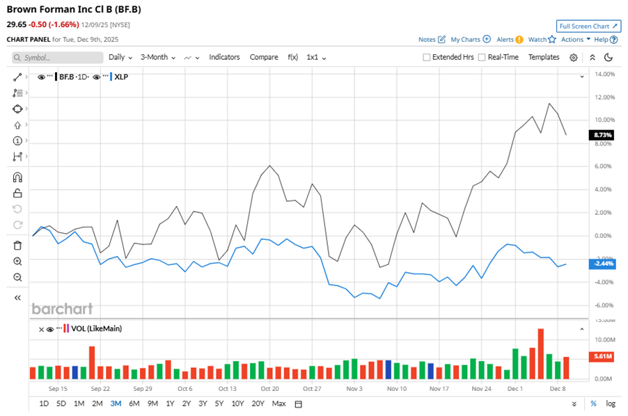Despite its notable strength, BF.B slipped 45.2% from its 52-week high of $46.22, achieved on Dec. 5, 2024. Over the past three months, BF.B stock gained 8%, outperforming the Consumer Staples Select Sector SPDR Fund’s (XLP) 3.4% dip during the same time frame.