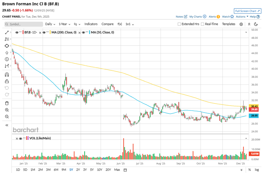 To confirm the bearish trend, BF.B has been trading below its 200-day moving average over the past year, with minor fluctuations. However, the stock is trading above its 50-day moving average since mid-November.