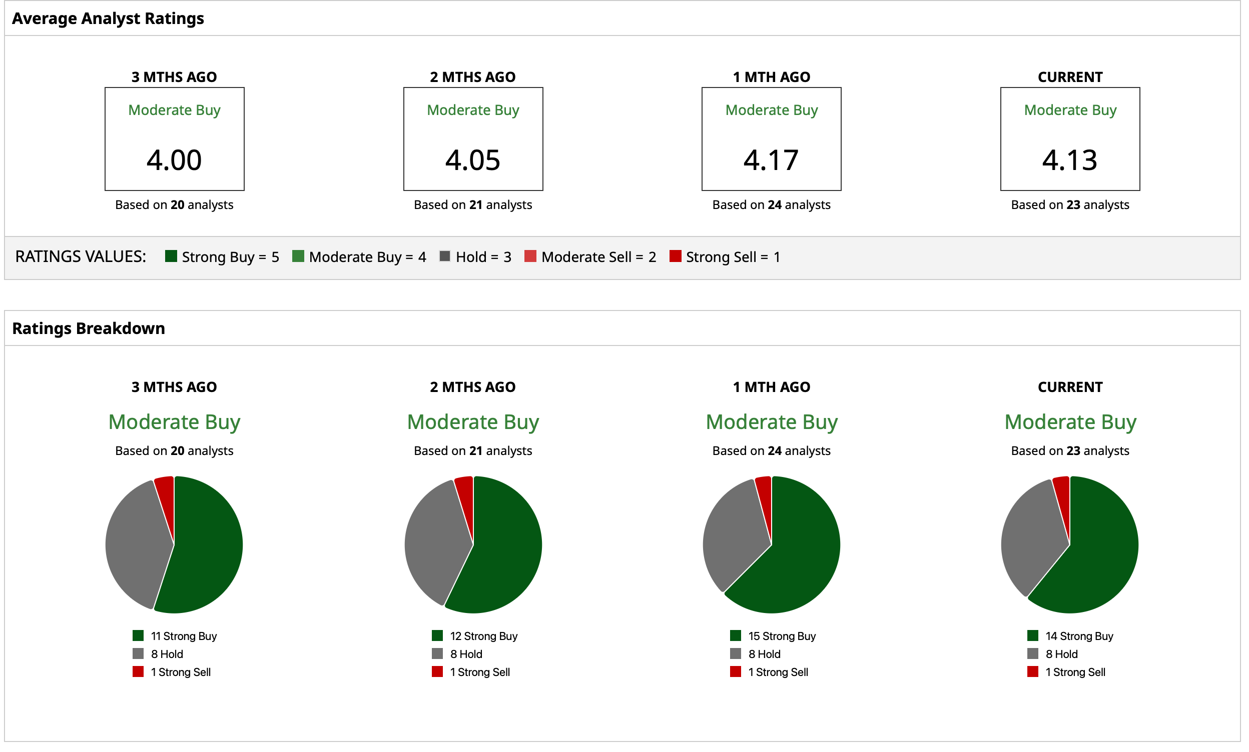 Thus, analysts remain cautiously optimistic about the NEE stock, attributing to it a consensus rating of “Moderate Buy,” with a mean target price of $89.62. This denotes an upside potential of about 12% from current levels. Out of 23 analysts covering the stock, 14 have a “Strong Buy” rating, eight have a “Hold” rating, and one has a “Strong Sell” rating.