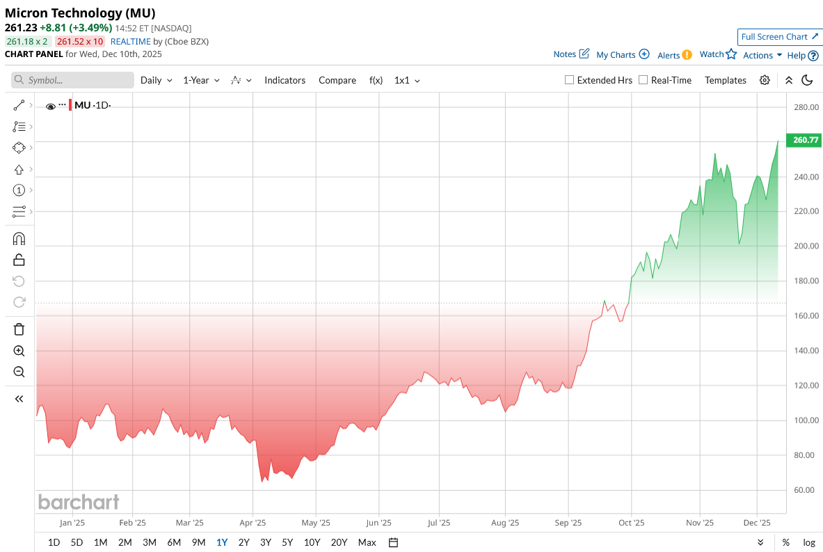 Valued at $285 billion by market cap, Micron’s stock has outperformed in 2025. Since the start of the year, MU shares have roughly tripled year to date (YTD), far outpacing the broader tech market. This surge came on the heels of surging demand for memory chips driven by the AI boom.